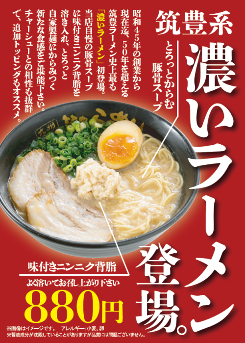 販売開始日/2021年12月10日(金)~ 商品名/濃いラーメン 販売価格/880円(税込) ※一部販売していない店舗もございますので、店舗にお問い合わせのうえご来店をおすすめいたします。