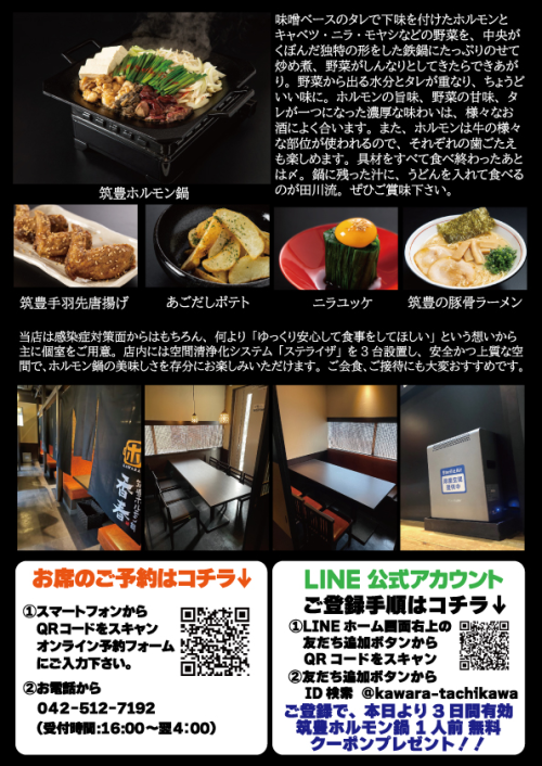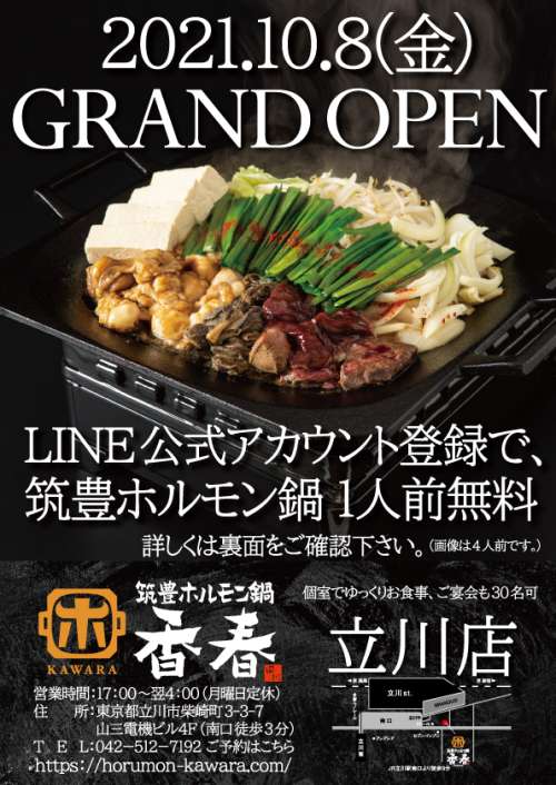 令和3年10月8日(金)、『筑豊ホルモン鍋 香春』の関東エリア1号店として、東京都立川市柴崎町にオープンいたします。