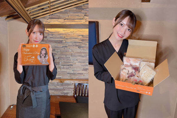 バレンタイン企画の特典として、田中菜津美写真入りオリジナルパッケージを2種類と、 1箱につき2枚のオリジナルのポストカード(全8種類)が付きます。 2022年のバレンタインはチョコと「筑豊ホルモン鍋」をご堪能ください。