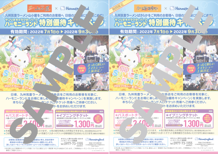 ※パスポートチケットは7月15日から通常3,300円となります。 ※各店に設置のチラシを「ハーモニーランド」の入口チケット売場にご持参で、特別料金にてご入場できます。(チラシ1枚で5名様までご利用いただけます) ※ご不明な方はチラシに記載の電話番号までお尋ねください。