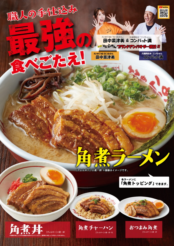 豚角煮2枚、人気の煮玉子半分、焼きのりをトッピングしたボリューム満点のラーメン。甘辛タレがとんこつスープに絶妙にマッチします。
